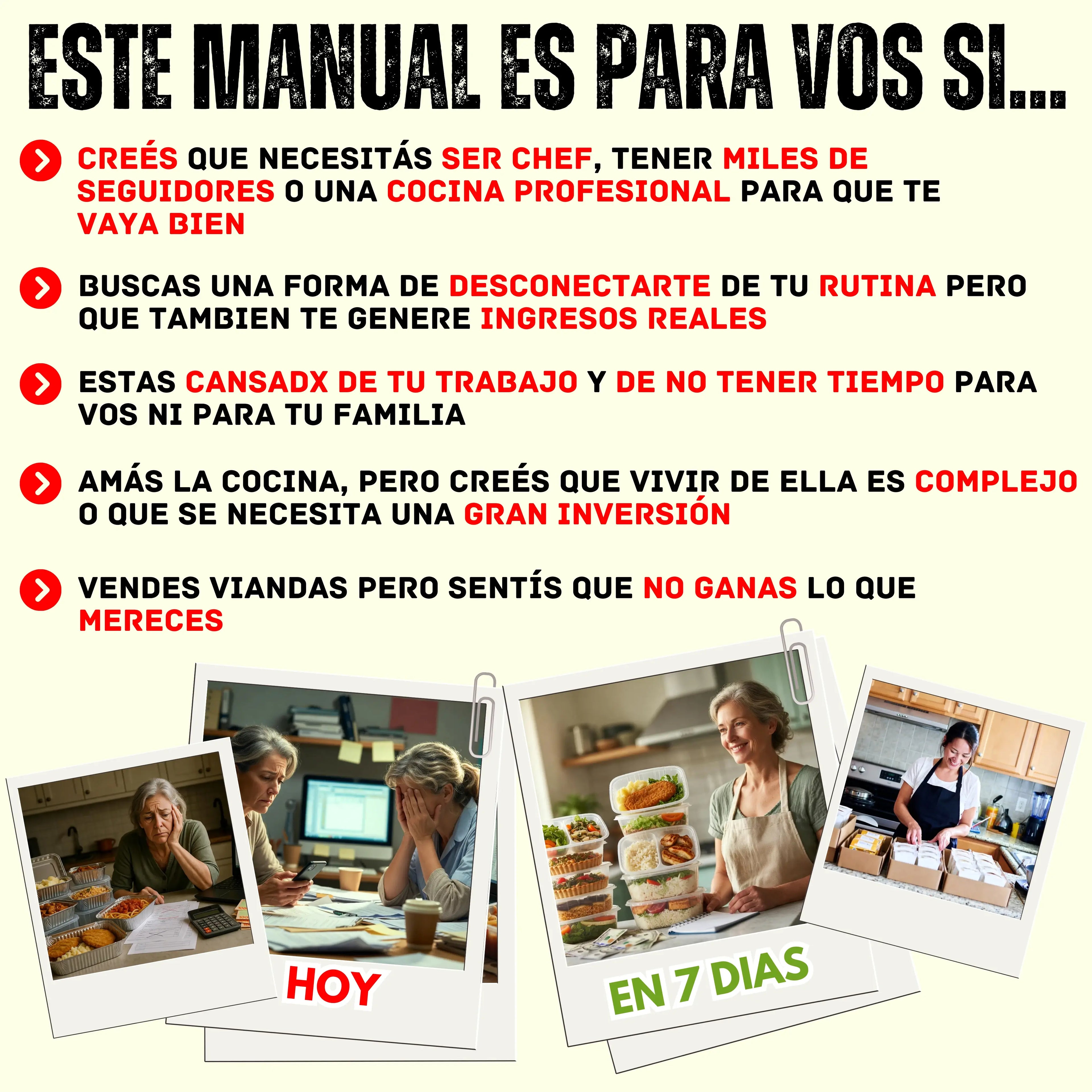 No. El manual está diseñado para principiantes, pero también incluye herramientas avanzadas para quienes ya venden viandas y quieren mejorar su habilidad y rentabilidad.
